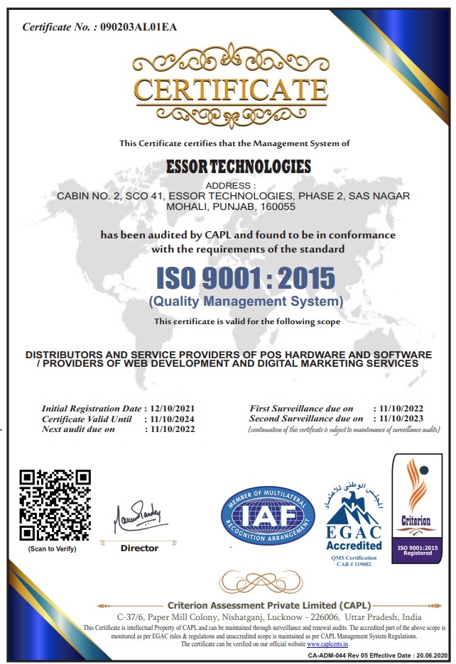Essor Technologies is now ISO certified 9001 : 2015 (Quality Management System) for scope of POS Hardware & Software and Web Development & Digital Marketing.